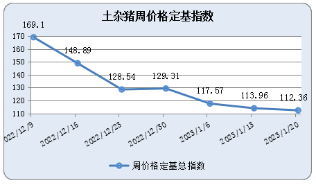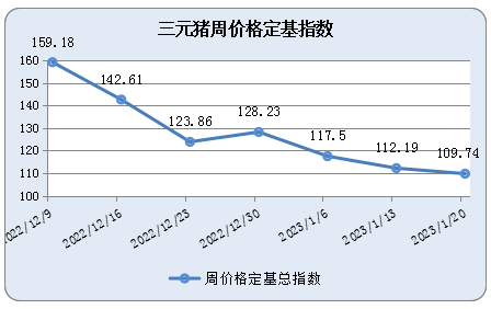 本周(1月14日-1月20日)金鑼集團(tuán)三元豬周價格定基指數(shù)為109.74點(diǎn),環(huán)比下調(diào)2.45點(diǎn)。 本周(1月14日-1月20日)金鑼集團(tuán)土雜豬周價格定基指數(shù)為112.36點(diǎn),環(huán)比下調(diào)1.6點(diǎn)。